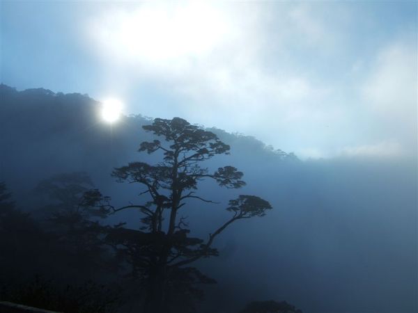 霧中行車,有點冷,風衣被水氣弄得有點濕,不過霧裡的景色真是變化多端,一幅幅中國山水畫在我眼前晃過;除了白到不見底的霧,還有藍天映照的藍色霧、陽光穿透的金黃霧,可都是我沒看過的景色;最棒的邂遘要屬「黑長尾雉」了,壓根我都沒想到會碰到這傳說中的帝雉;騎著車穿過深不見底的白霧,視野最多三公尺,一個轉彎,一隻一公尺長的大鳥從地上跳上水泥護欄,我被突如其來的變化嚇一跳,停車,正好在帝雉前兩公尺停下,牠看了我五秒,自顧自的沿著水泥護欄往我反方向走(老實說,我以為牠會躲到護欄後),遇到反光標還跳過去繼續走,我這時才想到拿相機,牠看我有大動作又離我更遠了...最後在牠躲入草叢前,我拍了張很不清楚的照片...可惜啊!