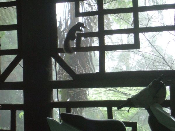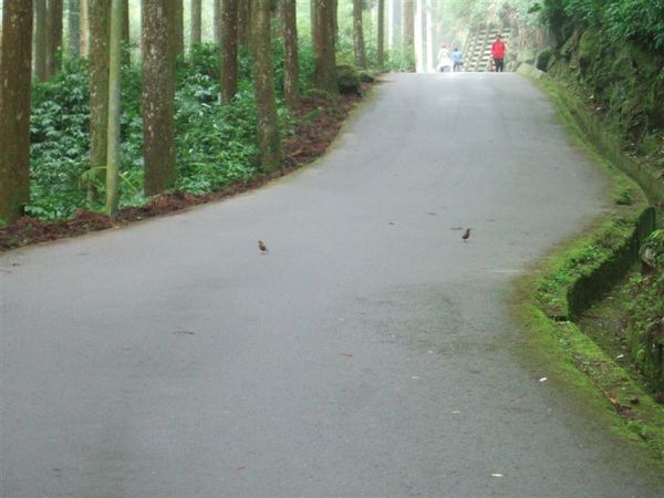 回到溪頭,買票入場(150),起霧帶雨,走到大學池附近,坐在休息區,吃剛買得餅乾當午餐,順便等雨停,有人用地瓜餵小動物,還真的吸引了鳥、松鼠來吃耶;人好多,假日果然有差啊!